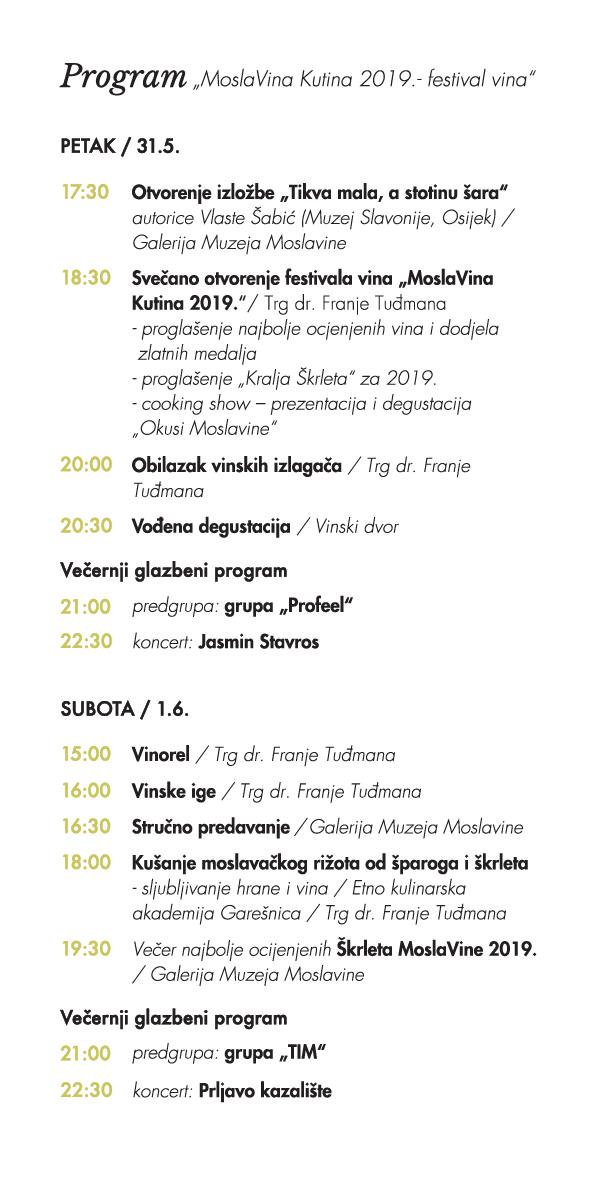 Program obuhvaća: izložbu vina, predstavljanje lokalnih vinara i njihovih gostiju, vođene degustacije, zanimljive radionice i edukacije, sajamski dio, vinsku biciklijadu, te zabavne sadržaje i ugostiteljsku ponudu.
